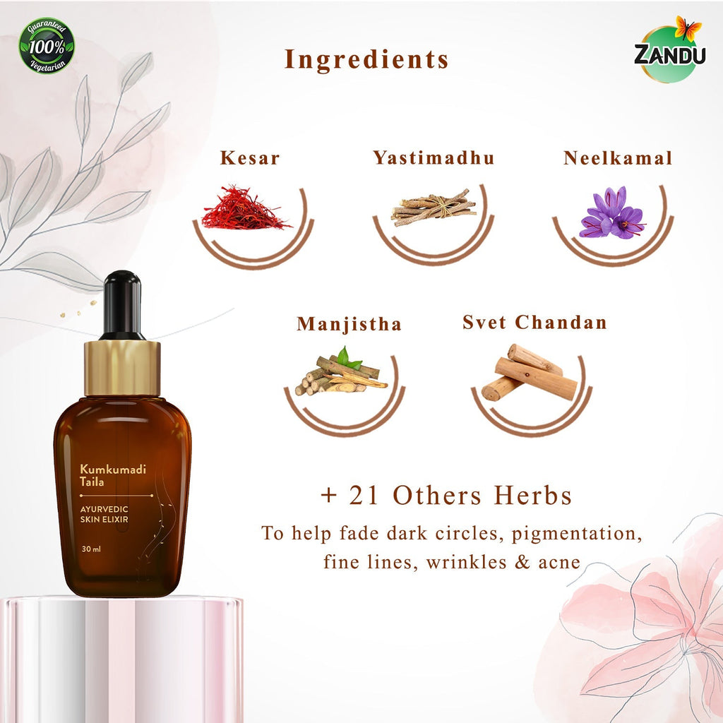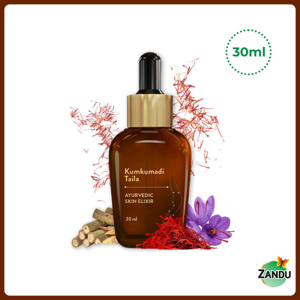 Skincare is an essential part of the beauty regimen, and we all want to take care of our skin not just because it adds to the outer beauty but also because it boosts confidence. Ayurveda has developed effective solutions to all our skincare needs over the last 5000 years. Most of us rely on these natural solutions to maintain skin health, as they are chemical-free and safe for application. But, deriving benefits from such natural formulations is time-consuming and requires skill and effort, which is not possible in today’s world where we all are hard-pressed on time. Modern consumers need skin solutions that can be incorporated effortlessly into their hectic schedules. With over 100 years of Ayurvedic legacy, Zandu presents Kumkumadi Taila, a blend of time-tested Ayurvedic wisdom and expertise with the modern-day convenience to offer ageless skin benefits. Zandu Kumkumadi Taila is an Ayurvedic formulation prepared with natural oils & herbs such as Kumkum (Keshar), Yastimadhu, Manjishtha, Shvetachandana, Kamal, among the others for nourishing and improving skin health. It is scientifically proven* that Kumkumadi taila improves skin tone, helps reduce dark circles, pigmentation, acne, blemishes and pimples. Using this oil regularly also reduces tan and dullness while improving skin glow and nourishing the skin. It is a natural formulation free from chemicals, parabens, and sulphates. Make this Ayurvedic beauty elixir a part of your skincare routine and celebrate true beauty with glowing skin.