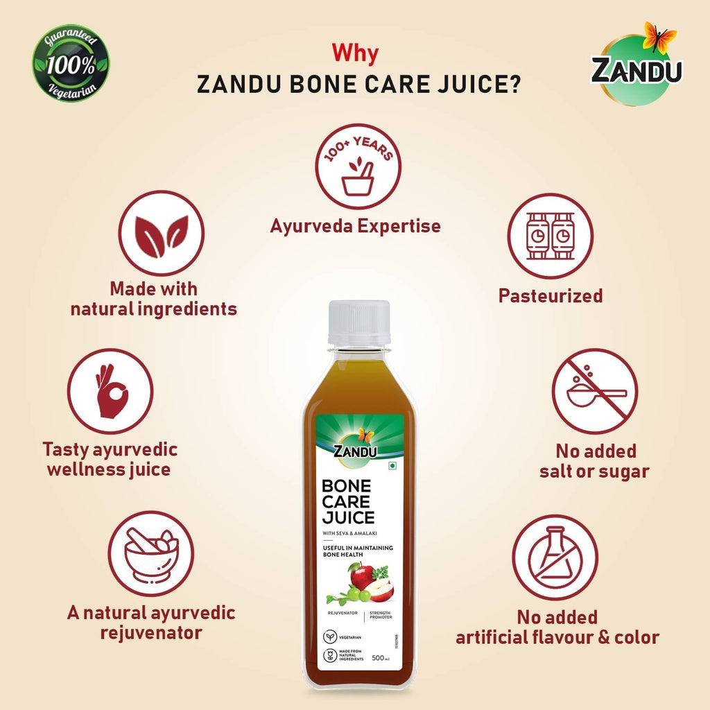 In this modern lifestyle in order to complete our daily roles & responsibilities, we tend to put a lot of strain on our bones without even realising it. We should start taking care of our bone health before it’s too late. Zandu introduces an Ayurvedic Bone Care Juice to assist in our journey to maintain healthy bones. Zandu Bone Care Juice uses Asthisamharaka(Cissus quadrangularis) as one of its chief ingredients, also called Hadjod in Hindi. This valuable herb has immense medicinal uses. It appears in the shape of a bone or a bone joint and is used extensively in the Ayurvedic formulations for its ability to help maintain and promote bone health. Zandu Bone Care Juice, apart from maintaining bone health also acts as a rejuvenator and a strength promoter. Along with Asthisamharaka / Hadjod (Veldt Grapes), it also includes many other valuable herbs into this unique blend such as: Amalaki, Apple, Mango, Daruharidra, Ashwagandha, Shigru and Rasna.These valuable ingredients blended together are known to provide strength & promote bone health. Backed by more than 100 years of Zandu’s legacy, our wellness juice is 100% natural & comes without additives like salt, sugar to offer you additional health benefits. Drinking this Bone care juice, a healthier & tastier wellness drink is a convenient solution for strengthening your bone & leading an active lifestyle!