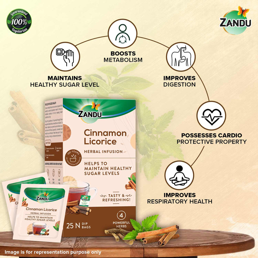 With the start of the pandemic, people worldwide have been relying on formulations to give them an edge in these uncertain times. Zandu’s range of infusions is packed with the goodness of Ayurveda and backed by modern science to provide a boost to your health in a quick, simple and reliable manner. Zandu Cinnamon Licorice Herbal Infusion brings you time-tested benefits in a hassle-free way. It comes in the form of dip bags containing cinnamon, licorice, green tea and peppermint without the addition of preservatives, flavours and artificial colouring. In recommended doses, it is known to maintain healthy sugar levels, improve respiratory health, aid in digestion and support the cardiovascular system due to its cardioprotective properties. This herbal tea is 100% vegetarian and fits the needs of every health-conscious consumer. The modern world requires easy and quick solutions to our health needs that can be seamlessly incorporated into our ever-changing daily routines. This is where the Cinnamon Licorice tea is a perfect fit and delivers timeless health benefits with zero compromises on taste.