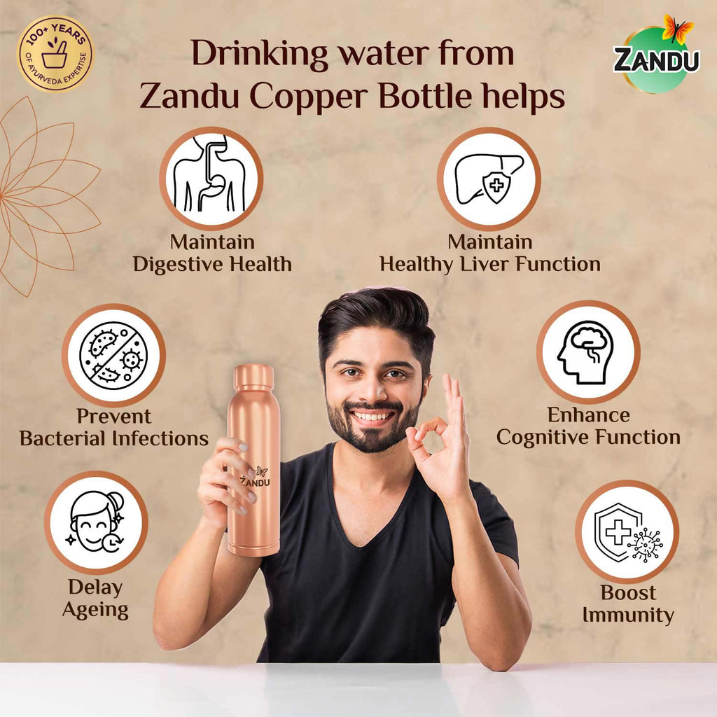 Zandu Copper Bottle has been made to incorporate the consumption of copper into your daily routine. It is one of the most vital minerals for your overall health as it has multiple health benefits. It cannot be consumed directly hence Zandu introduced this bottle in which you can store water and drink it. It is one of the easiest ways of self-care and health enhancement. Copper releases its ions in water when stored for a long. Hence it is recommended to drink water stored in this bottle for 8 hours, first thing in the morning on an empty stomach. It helps to balance the three important doshas of the body – Vata, Pitta and Kapha. It also helps to eliminate toxins from your body generated through food, water or air. Additionally, it helps in improving digestion, metabolism, immunity, cognitive health, slowing down ageing and maintaining liver health.