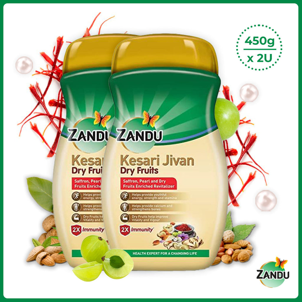 Zandu Kesari Jivan now comes with the benefits of Dry Fruits such as Kaju, Pista and Badam along with goodness of Kesar, Moti , Amla and many precious herbs. Prepared with the 100 years of Ayurvedic Wisdom of Zandu, it helps you stay fit and active so that you can live your life to the fullest, in today's everchanging and fast-paced lifestyle.