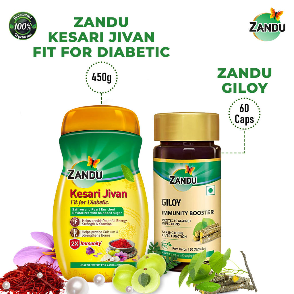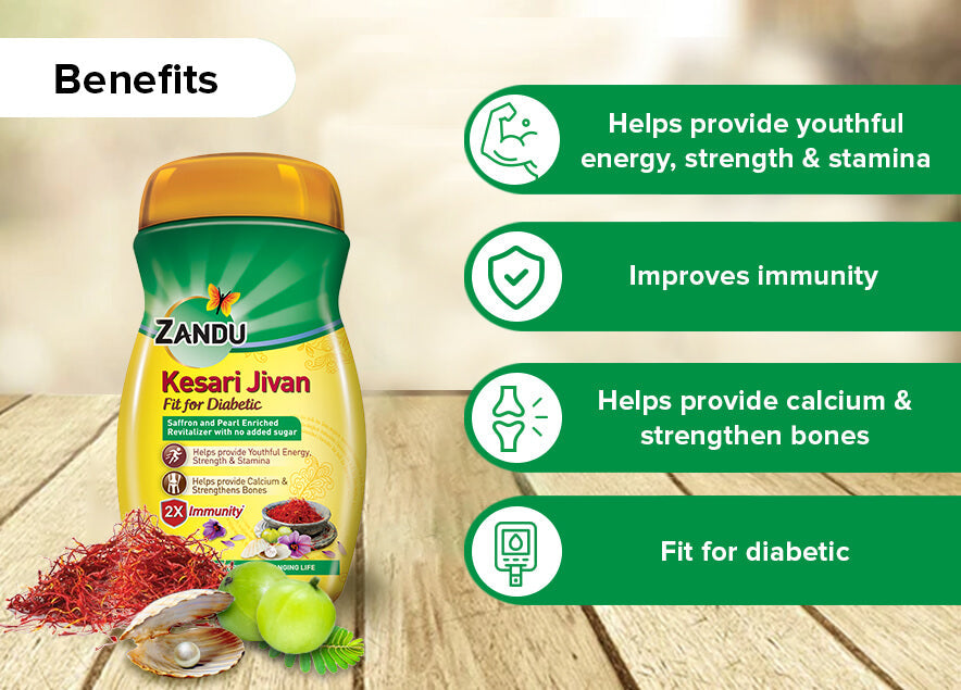 Zandu Kesari Jivan is specially formulated for those with high blood sugar levels. This daily revitalizer, enriched with saffron and pearl, helps to give energy, strength and stamina. Also improves calcium levels in the body