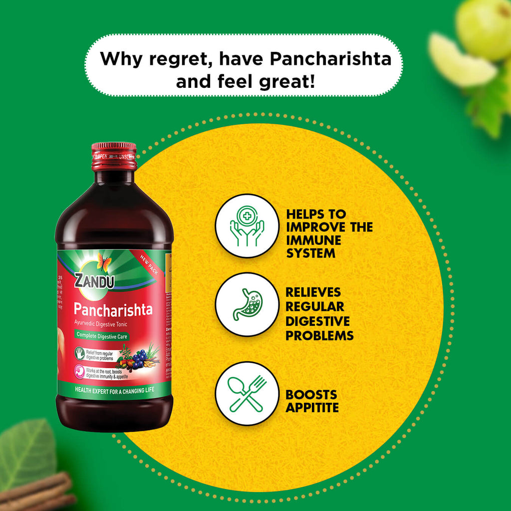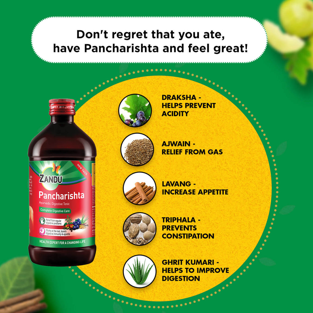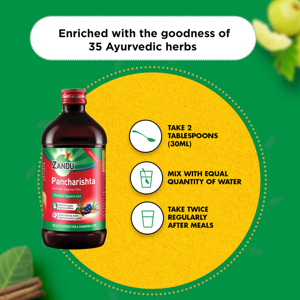 Zandu Pancharishta is a digestive tonic, enriched with the power of 35 ayurvedic herbs. It provides relief from recurring digestive problems such as indigestion, gas, acidity, flatulence, constipation and improves appetite