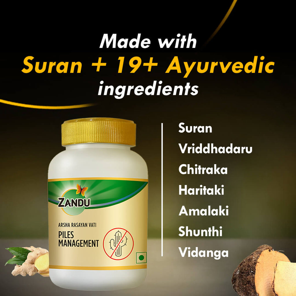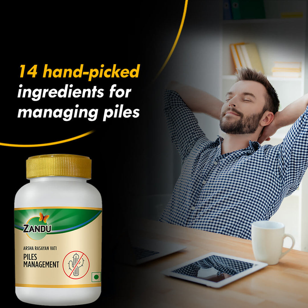 A small issue like haemorrhoids can cause enough pain to put a damper in a healthy life. Zandu's Arsha Rasayan Vati has been specifically formulated to stop the pain, swelling and irritation caused by piles (arsha) and help you get back to living your best life.