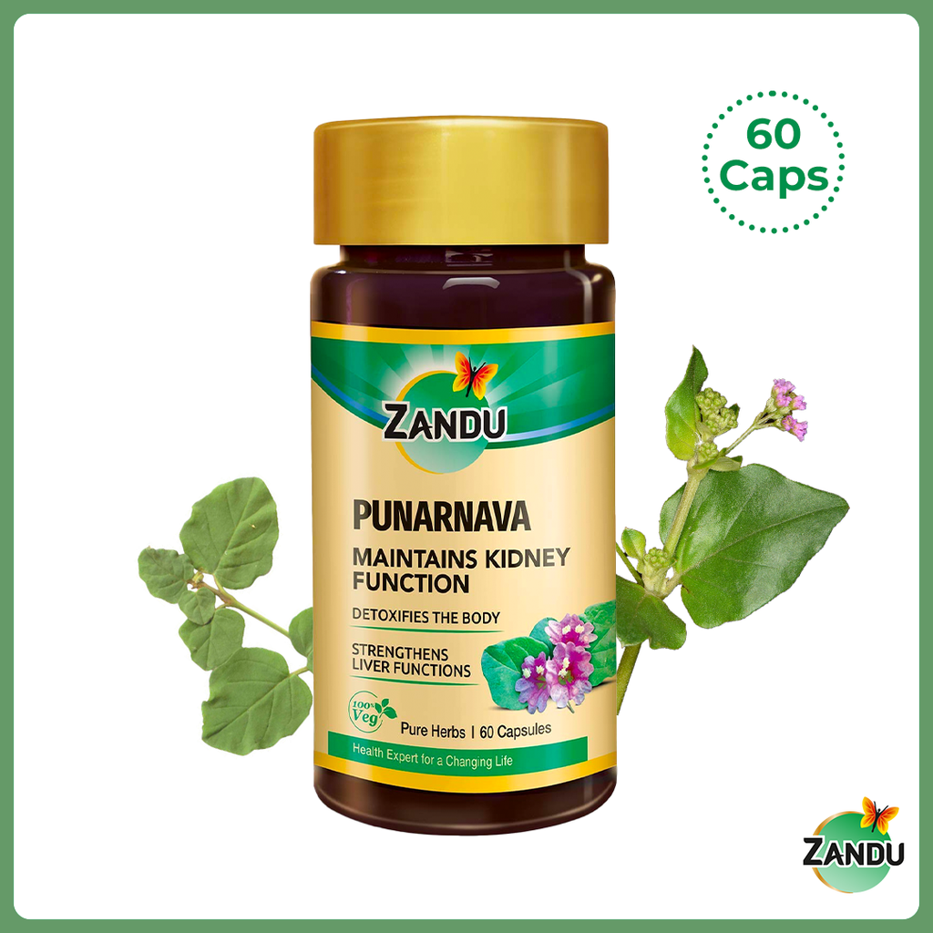 Zandu Punarnava Pure Herbs supplement is made with 100% pure extracts of Punarnava. Punarnava is beneficial in Kidney detox and supports the overall functions of the kidney. It helps treat urinary disorders.