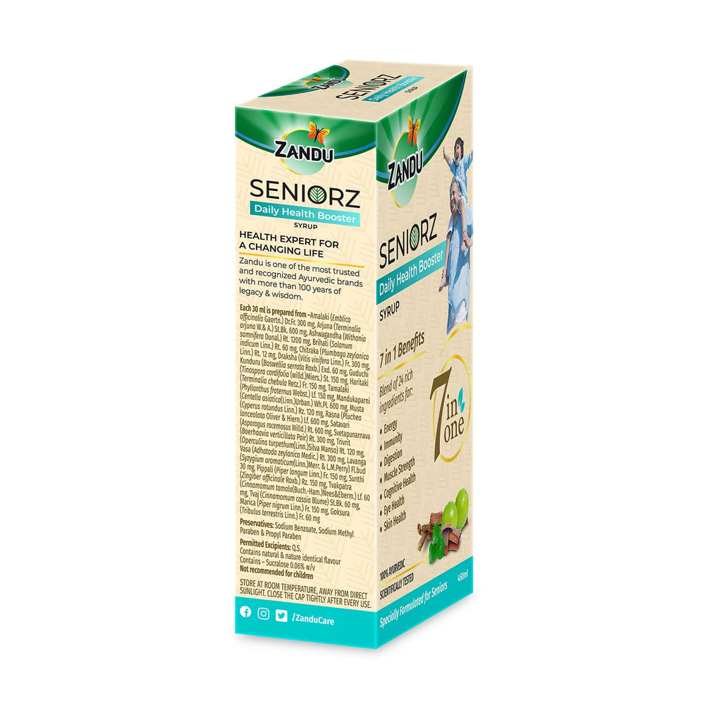 Zandu Seniorz Daily Health Booster Syrup has been developed specially for senior citizens. Age brings a plethora of ailments with it, as your body has gone through a lot of wear and tear over the years. You start losing your sheen, energy, immunity and more. This syrup helps to strengthen and improve your health holistically. It helps in improving energy, immunity, digestion, muscle strength, cognitive health, eye health and skin health. It is a blend of 24 rich ingredients sourced thoughtfully from the rich treasure of Ayurveda. It has ingredients like Ashwagandha, Amalaki, Arjuna, Mandukaparni and Sunthi which are known to heal multiple disorders, provide multiple health benefits and are some of the most popular / recommended ingredients of Ayurveda.