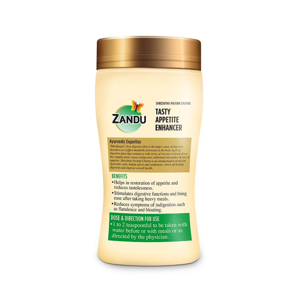 Zandu Shreshtha Pachan Churna is an appetite stimulant medicine formulated with Ayurvedic “Dipana” & “Pachana” herbs along with “Panchalavan” to improve appetite, maintain healthy digestion, and support metabolism. This appetite stimulant enhances hunger, helps in promoting digestion by stimulating digestive juices, and managing other digestion-related issues like tastelessness, loss of appetite, gas, bloating & flatulence, etc. Zandu Shreshtha Pachan Churna is an effective and tasty appetizer for healthy digestion and improved overall health.