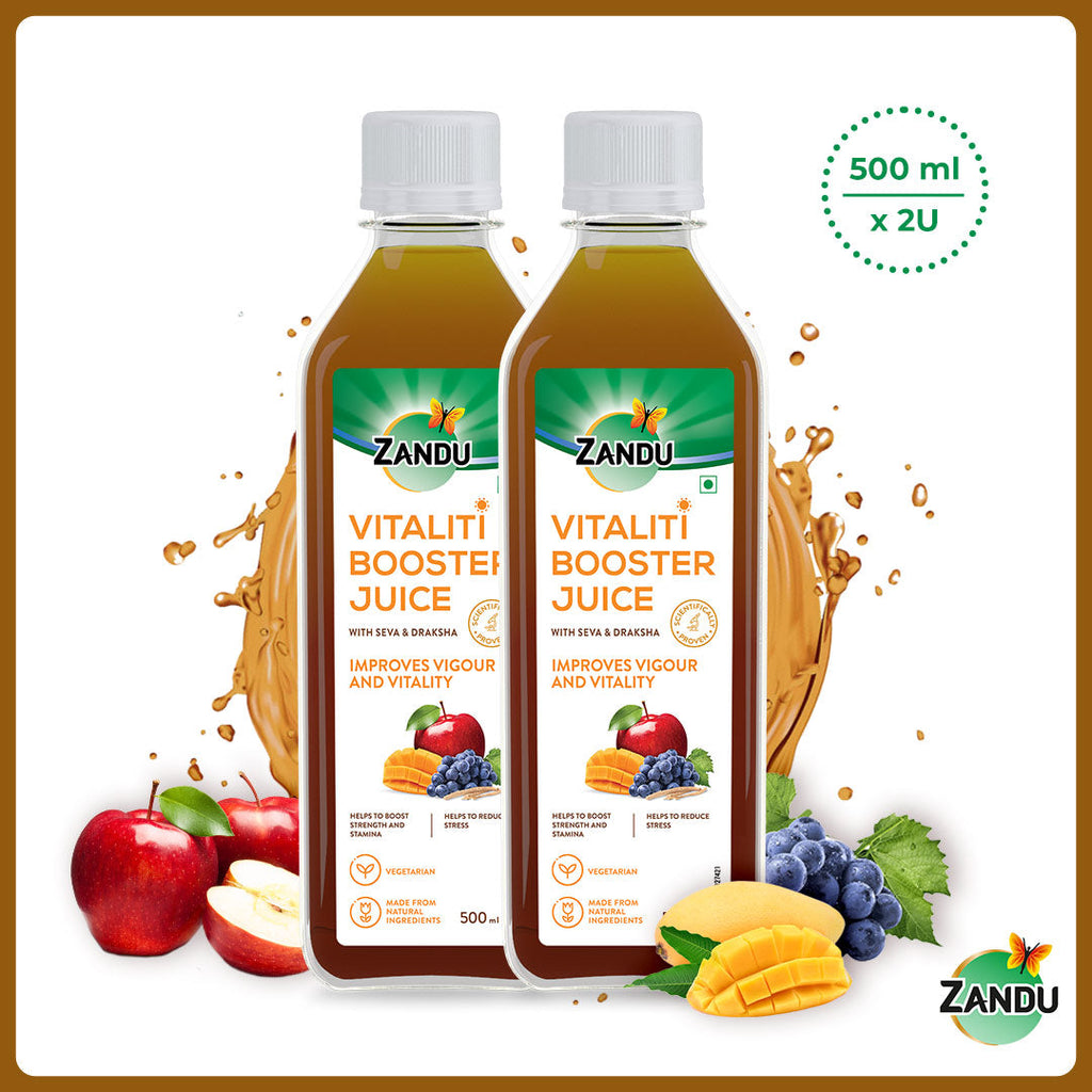 In today’s fast-paced world, one needs to keep their energy levels high for fulfilling their roles & responsibilities. Zandu brings you Vitality Booster Juice, an Ayurvedic energizer that has been scientifically proven to increase vigor & vitality*. Enriched with selected Ayurvedic ingredients like Shilajit, Ashwagandha, Safed Musali, Gokshura, Shatavari, Zandu Vitality Booster Juice can help increase vitality and vigor by focusing on all contributory factors that decrease stamina such as digestion, stress, lack of vitality, and above all performance anxiety. This juice is natural, safe and do not contain added sugar and salt. It’s time to give your energy levels a boost & be ready anytime, anywhere & always!