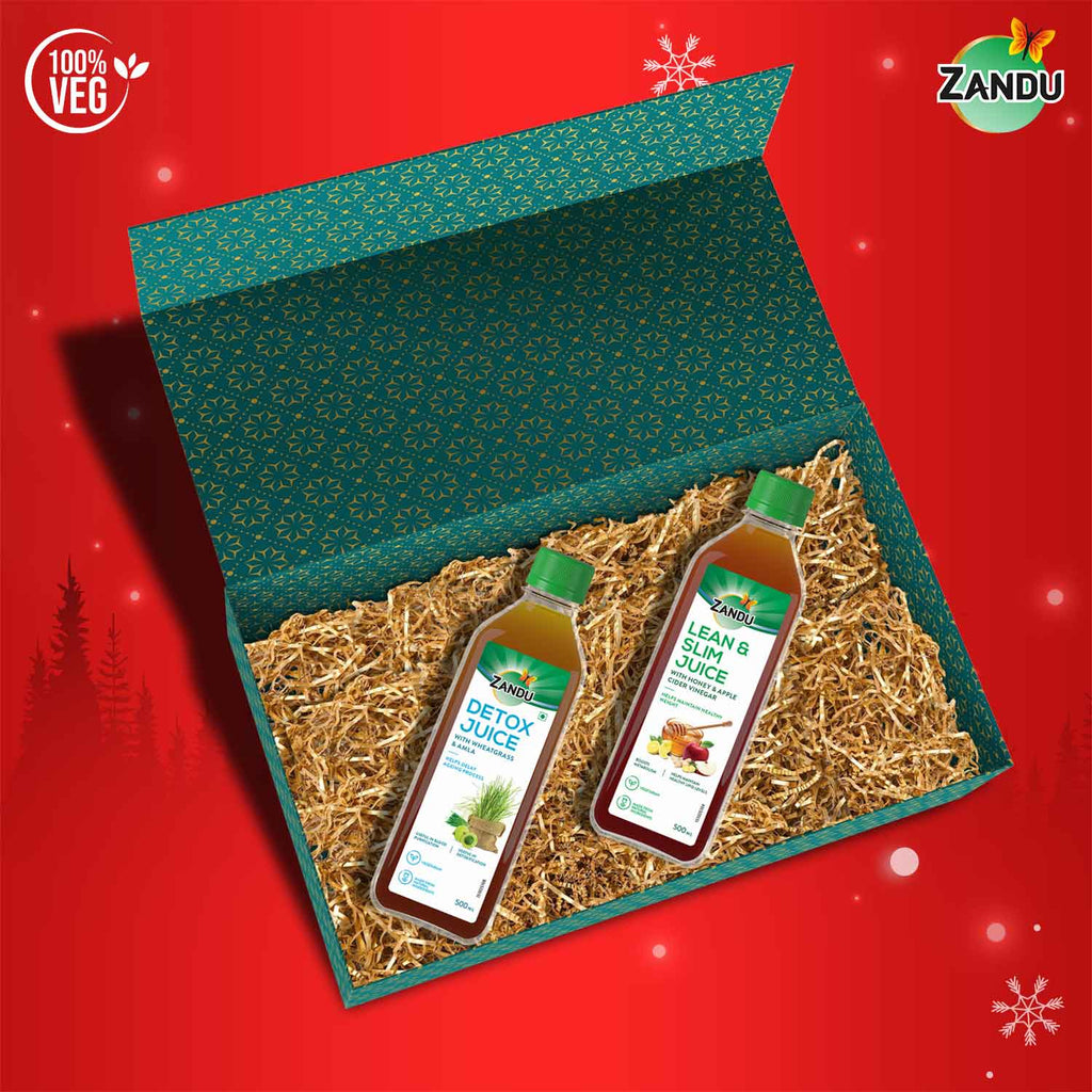 This Diwali, gift something that matters. Because your loved ones deserve a thoughtful gift which brings them the joy, happiness & good health that they deserve. All specially curated for them. Zandu presents a number of gifting options. One of the special combo being of Zandu Lean and Slim Juice + Detox Juice. For your loved ones who are struggling with weight management and looking for detox solutions, this combo provides the most convenient, economical, and effortless solution. Additionally, it is the go to combination for improving your gut health. Zandu Lean and Slim Juice helps maintain healthy weight, boost metabolism, and helps maintain healthy lipid levels. It us made with 100% natural ingredients like ginger, Lemon Juice, Apple Cider Vinegar, Honey. Zandu Detox Juice is an excellent detox and cleansing juice enriched with wheatgrass amla, which has the goodness of taste as well as health. It helps in delaying ageing process, useful in blood purification as well as detoxification. All you need to do is take 30 ml or 3 tablespoons of these juices in a glass of water and consume it 1 to 2 times daily. Now lose those extra kilos in the healthiest and tastiest way!