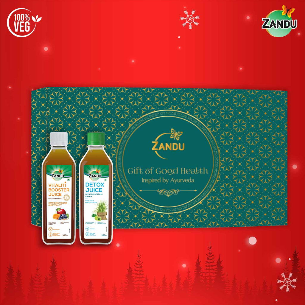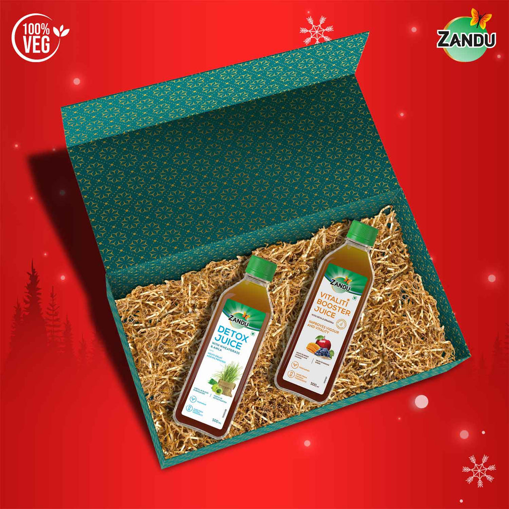 This Diwali, gift something that matters. Because your loved ones deserve a thoughtful gift which brings them the joy, happiness & good health that they deserve. All specially curated for them. Additionally, wellness is an area that has picked up the interest of everyone in recent times. This includes physical and mental wellness. For inner cleansing, detox and rejuvenation, there are several retreat experience options. Zandu brings you a special combo pack of Detox Juice + Vitaliti Booster Juice. It is a perfect juice combo for supporting detoxification and boosting stamina while reducing stress. Zandu Detox Juice is an excellent detox and cleansing juice enriched with wheatgrass amla, which has the goodness of taste as well as health. It helps in delaying ageing process, useful in blood purification as well as detoxification. Zandu Vitaliti Booster Juice is made up of apple, mango, shilajit and red grape and is scientifically proven to improve vigor and vitality. These specially curated wellness juices come with the promise of ancient Ayurvedic wisdom in a contemporary form that is great in taste even without the use of added sugar, salt, flavours, or colours. Choose this power-packed combination of taste and health to make a real difference in your wellness regimen!