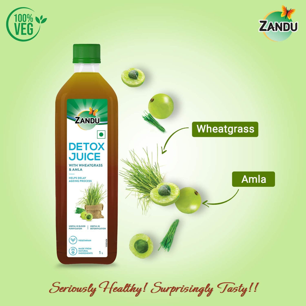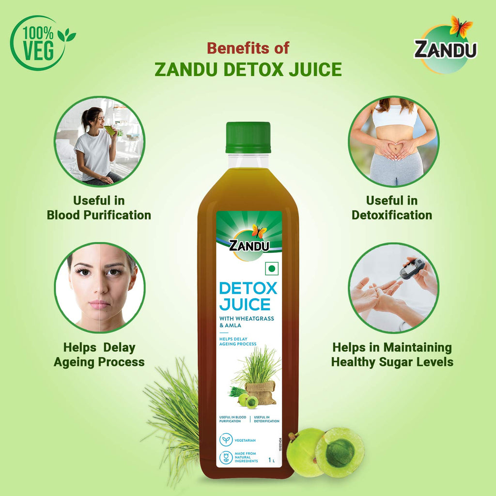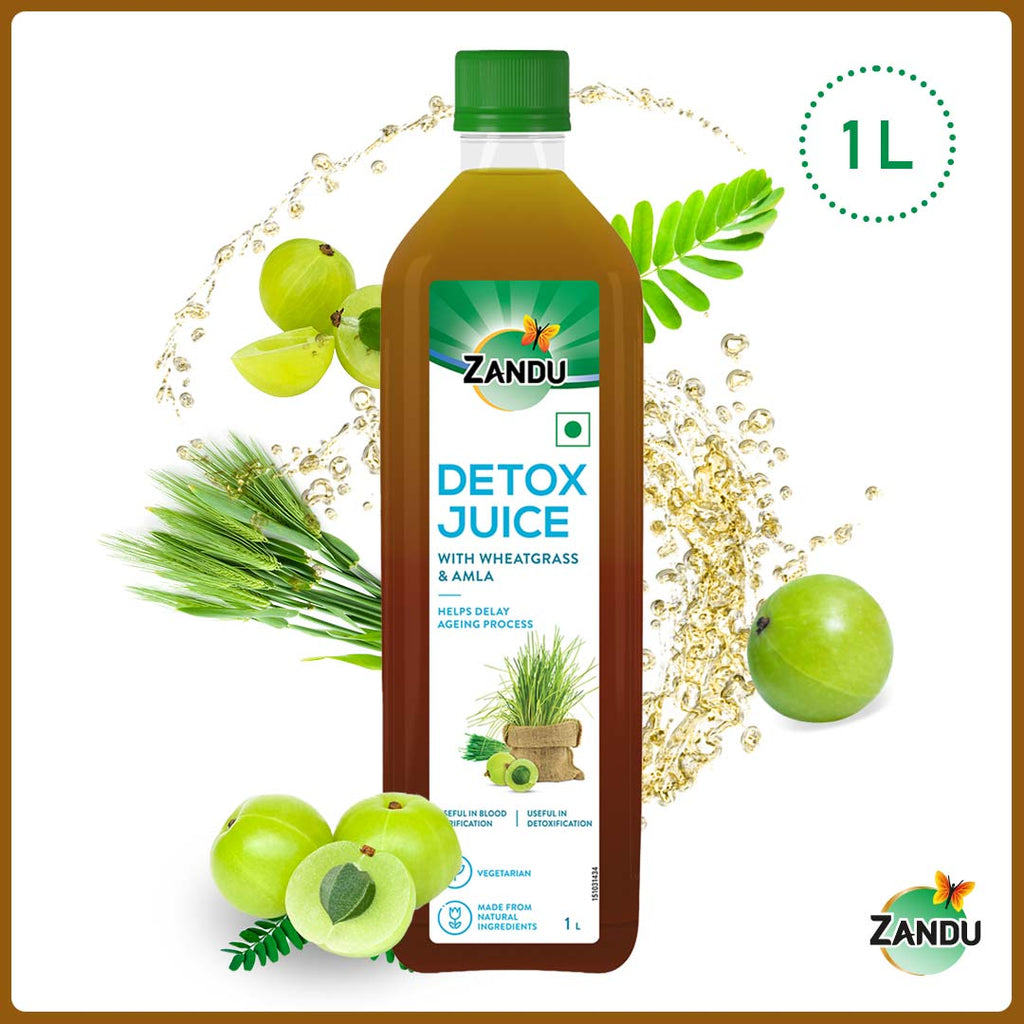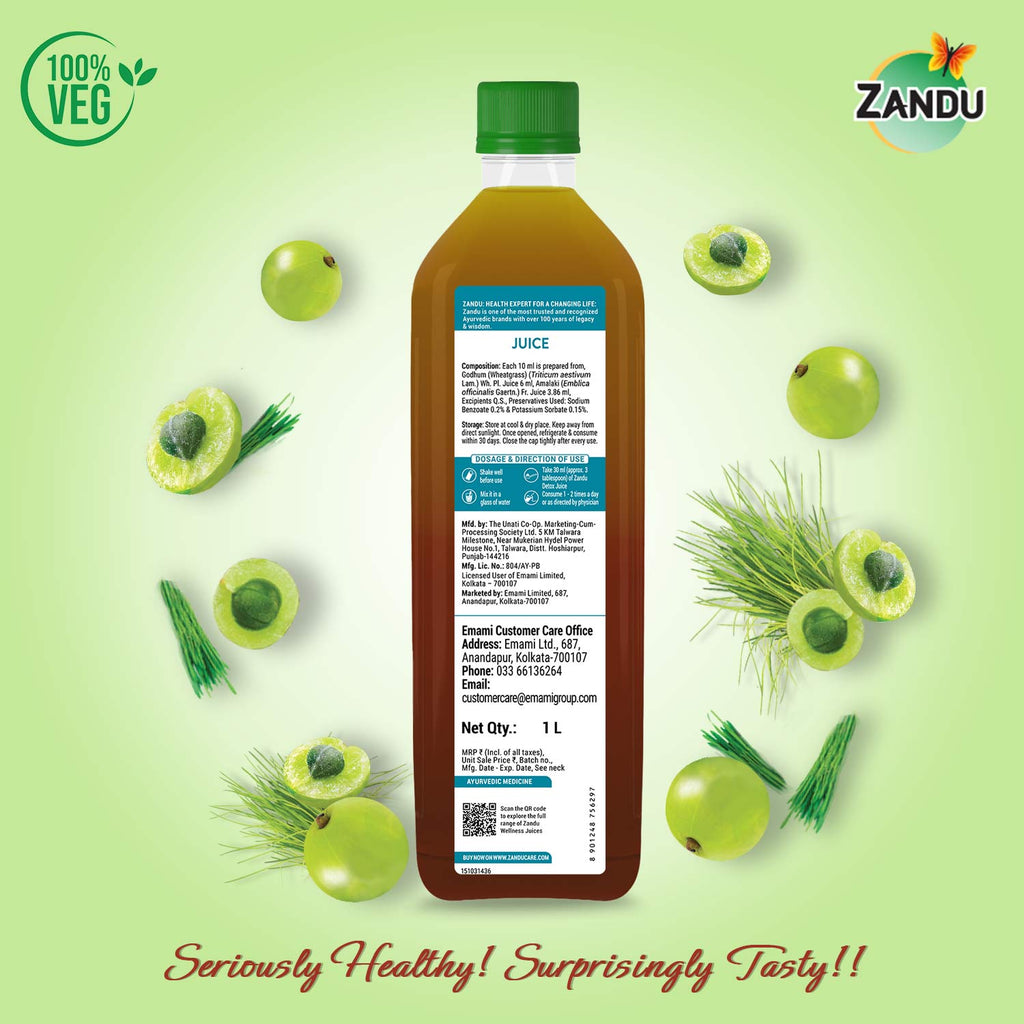 Zandu Detox Juice is formulated with the finest quality of Godhum (Wheatgrass) plant and Amalaki (Amla) fruit. Ingredients are blended, pasteurized and packed in the form of juice that is quick and easy to consume on the go or at work. It is helpful in detoxification and blood purification. It delays the ageing process, promotes skin, hair and bone health, boosts your energy and immunity, maintains healthy sugar levels and improves digestion. The pandemic has seen a lot of people taking their health seriously with booster juices. Our range of Wellness Juices is designed to fill the gap in the market for effective Ayurvedic formulations from a trusted and established source. Zandu Detox Juice, with Wheatgrass and Amla, is a body detoxification drink that supports overall health for your physical and mental wellbeing. Zandu Detox Juice is a long-term wellness partner for a happy and healthy life. With this Ayurvedic detox juice, celebrate true wellness with zero compromises on taste or convenience.