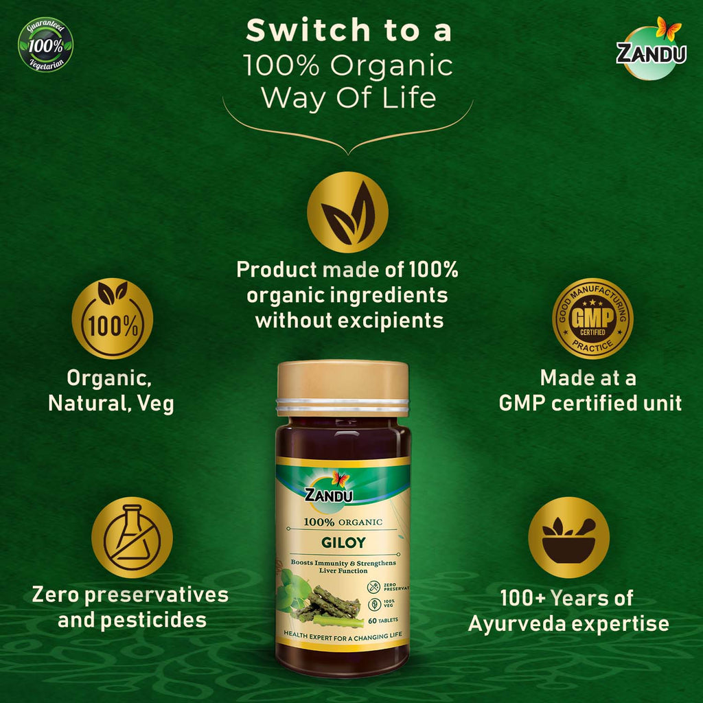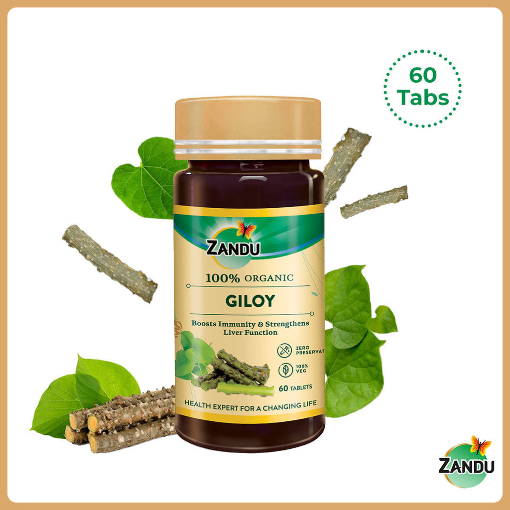 The human body is a complex system that relies on a variety of natural ingredients to function effectively. For centuries, we all have relied on our natural surroundings to supply fresh, pure and life-giving nutrients that deliver lasting benefits. Ayurveda is based on this delicate relationship between humans and their surroundings. According to Ayurveda, the universe is composed of five essential elements (Panchamahabhutas). These elements are space, fire, wind, water, and earth. Without a healthy balance of these elements, our natural well-being can go out of order. At Zandu, we follow this philosophy of bringing natural elements and nutrients to people. 100% Organic Giloy tablets from the house of Zandu are formulated from 100% organic and natural Giloy (Guduchi) extracts. These tablets are known to act as an immunity booster and strengthen liver function. It also helps maintain healthy sugar levels, support your digestive system and contain antioxidant compounds that give your skin a healthy glow. These medicines contain no added sugar, salt, colours, flavours, preservatives, or chemicals. Organic Giloy tablets from Zandu are a perfect partner for people who lead busy lives and want an easy and convenient solution for the well-being of their health.