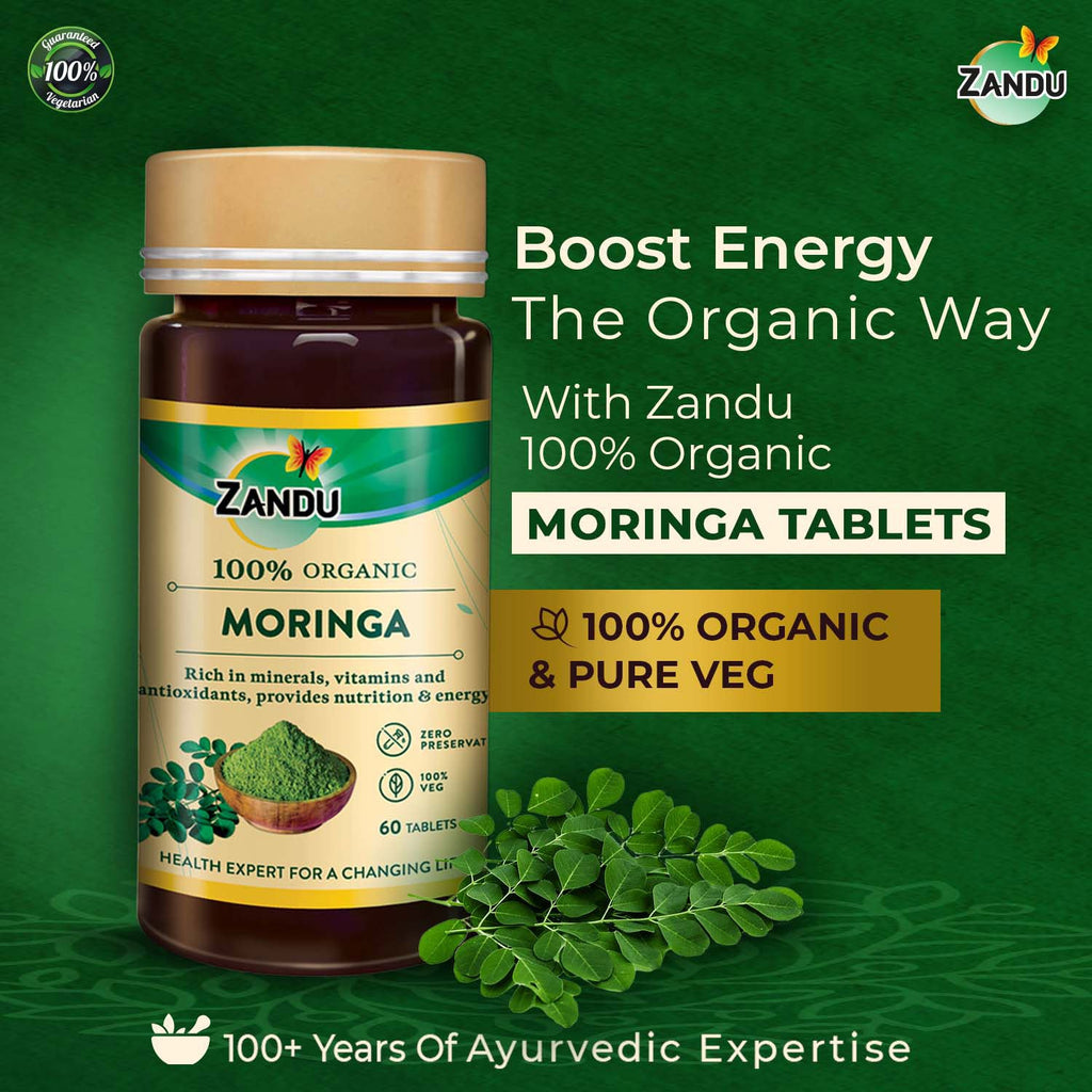 Nature has been an indispensable source of nourishment and healing for us since the beginning of time. The natural world can offer many health benefits that man-made compounds cannot match. The early pioneers of Ayurveda had recognized this fact and have developed effective solutions to all our health needs over the last 5000 years. Deriving benefits from nature is time-consuming and requires skill and effort, but the results are worth it. In today’s scenario, it is not feasible to put the same time and energy into Ayurvedic formulations at an individual level. Today, consumers require health and wellness solutions that can be incorporated easily into their hectic schedules. Now we can get the same benefits without the hassle, thanks to the marvel of Zandu’s modern technique of packaging and manufacturing. Zandu presents Organic Moringa tablets that combine the time-tested expertise of Ayurveda with the ease of modern-day medicine. Prepared from pure and organic Moringa powder, these tablets are completely natural and can be easily consumed anywhere and at any time. These moringa tablets benefits are manifold. They are a rich source of minerals like calcium, iron, and potassium and contain ample Vitamins like A, C, and E, thereby acting as an energy booster. They do not contain any preservatives, added flavours, and colours and are 100% organic. Incorporate this organic herb into your wellness routine and experience the goodness of nature!