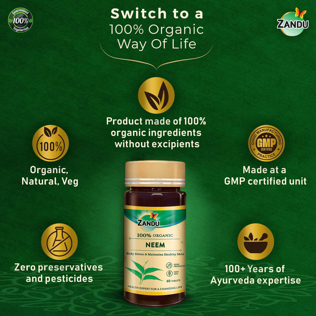 Since ancient times, we have relied on Ayurveda and its many natural benefits to lead a healthy and active life. In today’s world, we require health and wellness solutions that can easily fit into our lives and provide us with all the timeless Ayurvedic benefits in an easy-to-use form. Organic Neem tablets blend the Ayurvedic wisdom spanning over 5000 years and modern-day convenience perfectly to offer a solution that enables you to keep your health and wellbeing intact. Curated from the natural extracts of a single herb in its unaltered & natural composition, Organic Neem Tablet is pure and natural with zero preservatives, no added flavours and colours. Made from Neem leaves extract, these tablets help eliminate impurities from the body and aids in detoxification. Regular consumption also helps to maintain healthy skin and protects against various infections. With these Organic Neem Tablets by Zandu, heal your body with nature’s goodness!
