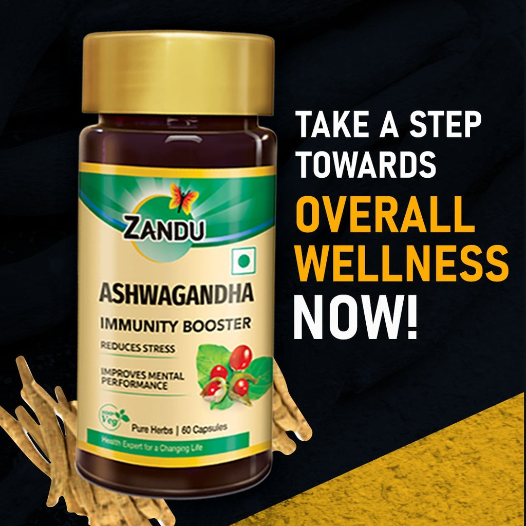 Zandu Ashwagandha Pure Herbs Capsules are formulated with 100% pure extracts of the finest quality Ashwagandha with 2x Immunity. Known as an adaptogenic, Ashwagandha acts as an effective stress buster and boosts mental performance. Hence, this supplement helps to manage your day-to-day life effectively and naturally. Regular consumption can reduce cortisol levels and improve immunity. This supplement also helps to relieve fatigue and weakness by restoring your natural body strength. *Scientifically Proven basis Laboratory N.K. Cell Activity