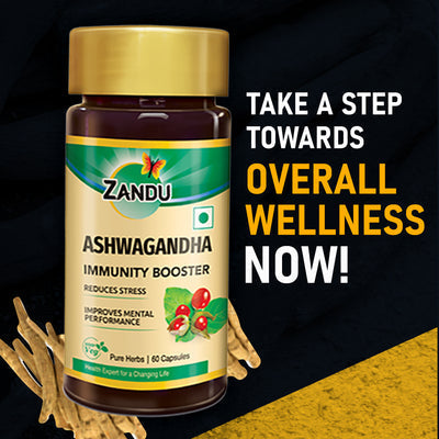 Zandu Ashwagandha Pure Herbs Capsules are formulated with 100% pure extracts of the finest quality Ashwagandha with 2X* Immunity. Known as an adaptogenic, Ashwagandha acts as an effective stress buster and boosts mental performance. Hence, this supplement helps to manage your day-to-day life effectively and naturally. Regular consumption can reduce cortisol levels and improve immunity. This supplement also helps to relieve fatigue and weakness by restoring your natural body strength. *Scientifically Proven basis Laboratory N.K. Cell Activity