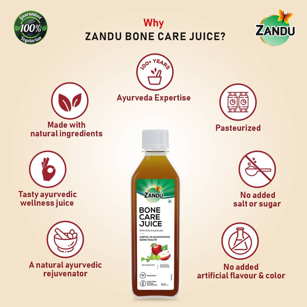 In this modern lifestyle in order to complete our daily roles & responsibilities, we tend to put a lot of strain on our bones without even realising it. We should start taking care of our bone health before it’s too late. Zandu introduces an Ayurvedic Bone Care Juice to assist in our journey to maintain healthy bones. Zandu Bone Care Juice uses Asthisamharaka(Cissus quadrangularis) as one of its chief ingredients, also called Hadjod in Hindi. This valuable herb has immense medicinal uses. It appears in the shape of a bone or a bone joint and is used extensively in the Ayurvedic formulations for its ability to help maintain and promote bone health. Zandu Bone Care Juice, apart from maintaining bone health also acts as a rejuvenator and a strength promoter. Along with Asthisamharaka / Hadjod (Veldt Grapes), it also includes many other valuable herbs into this unique blend such as: Amalaki, Apple, Mango, Daruharidra, Ashwagandha, Shigru and Rasna.These valuable ingredients blended together are known to provide strength & promote bone health. Backed by more than 100 years of Zandu’s legacy, our wellness juice is 100% natural & comes without additives like salt, sugar to offer you additional health benefits. Drinking this Bone care juice, a healthier & tastier wellness drink is a convenient solution for strengthening your bone & leading an active lifestyle!