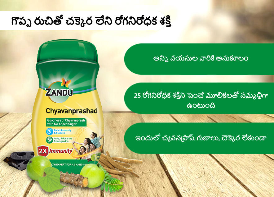 జాండు చ్యవన్ప్రషాద్ చక్కెర రహిత రోగనిరోధక శక్తిని పెంచేది, ఇది 40 ఆయుర్వేద మూలికలతో తయారు చేయబడింది, ఇది చక్కవాన్ప్రష్ యొక్క చక్కెరతో అదనపు చక్కెర లేకుండా వస్తుంది. ఇది జాండు యొక్క 100 సంవత్సరాల ఆయుర్వేద జ్ఞానం మరియు పరిశోధనతో తయారు చేయబడింది, జాండు చ్యవన్ప్రషాద్ 2X ఇమ్యునిటీ బేసిస్ లాబొరేటరీ నేచురల్ కిల్లర్ సెల్ (ఎన్.కె.సెల్) కార్యాచరణకు శాస్త్రీయంగా నిరూపించబడింది. ఇది బలం మరియు శక్తిని పెంచడానికి కూడా సహాయపడుతుంది. 1 టీస్పూన్ తీసుకోవడం, రోజుకు రెండుసార్లు పాలతో కలిపి ఆరోగ్యంగా మరియు శక్తివంతంగా ఉంటుంది. ఆధునిక వినియోగదారుల యొక్క ఎప్పటికప్పుడు పెరుగుతున్న ఆరోగ్య అవసరాలపై దృష్టి సారించిన, చక్కెర మనస్సాక్షిని నడిపించేటప్పుడు, ఆరోగ్య స్పృహ ఉన్నవారికి రోగనిరోధక శక్తి యొక్క ance చిత్యాన్ని కూడా నడిపించే చయావన్ప్రాష్ విభాగంలో మార్గదర్శకులలో జాండు చ్యవన్ప్రషాద్ ఒకరు.