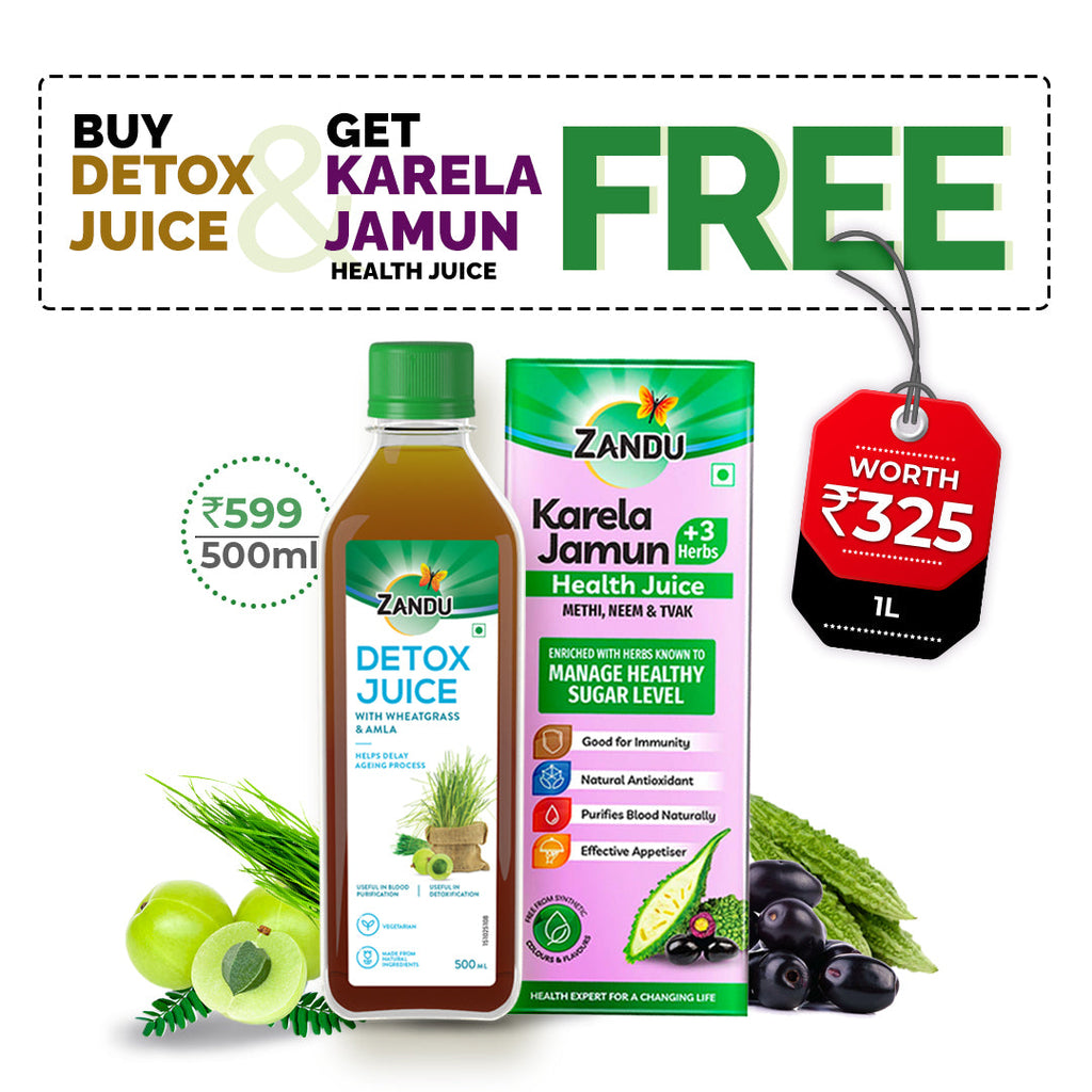 Zandu Detox Juice is formulated with the finest quality of Godhum (Wheatgrass) plant and Amalaki (Amla) fruit. Ingredients are blended, pasteurized and packed in the form of juice that is quick and easy to consume on the go or at work. It is helpful in detoxification and blood purification. It delays the ageing process, promotes skin, hair and bone health, boosts your energy and immunity, maintains healthy sugar levels and improves digestion. The pandemic has seen a lot of people taking their health seriously with booster juices. Our range of Wellness Juices is designed to fill the gap in the market for effective Ayurvedic formulations from a trusted and established source. Zandu Detox Juice, with Wheatgrass and Amla, is a body detoxification drink that supports overall health for your physical and mental wellbeing. Zandu Detox Juice is a long-term wellness partner for a happy and healthy life. With this Ayurvedic detox juice, celebrate true wellness with zero compromises on taste or convenience.
