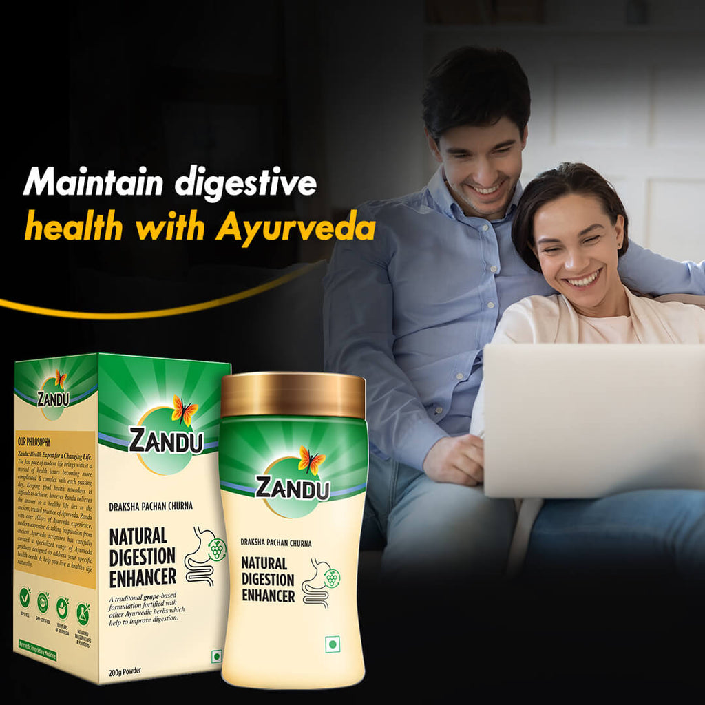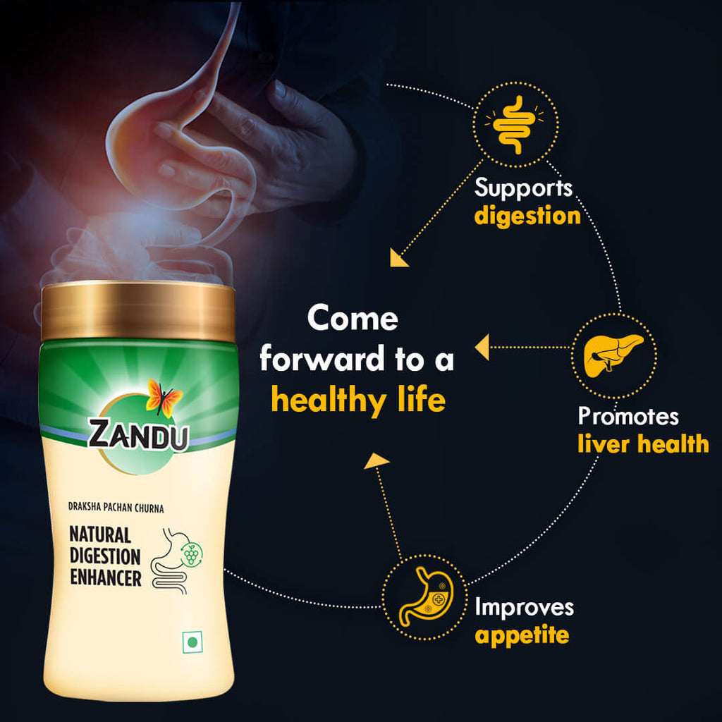 Zandu Natural Digestion Enhancer (Draksha Pachan Churna) as its name suggests supports digestion and helps revive appetite. Regular use of this ancient Ayurvedic remedy reduces digestive discomforts including bloating and flatulence. It is also useful for promoting liver health.