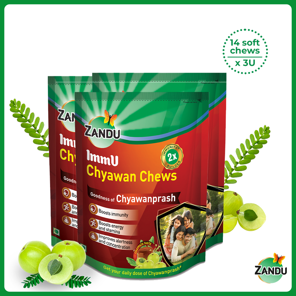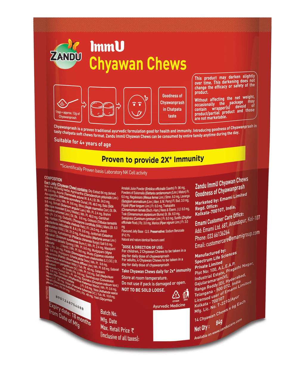 DescriptionChyawanprash is a proven traditional ayurvedic formulation good for health and immunity. Introducing goodness of chyawanprash in tasty chatpata soft chews format. Zandu ImmU Chyawan Chews can be consumed by entire family anytime during the day.