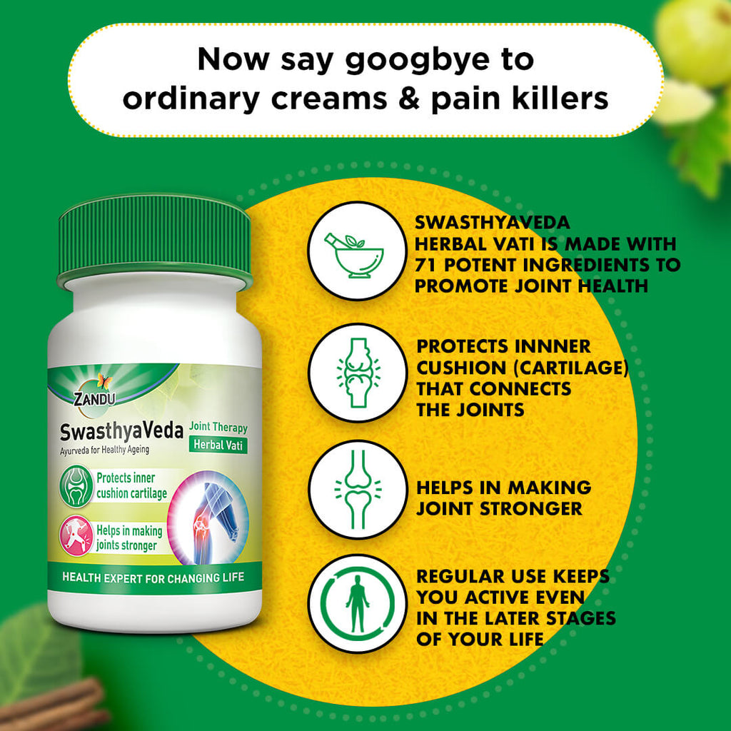 Zandu SwasthyaVeda Herbal Vati is an Ayurvedic tablet made with 71 potent ingredients to promote joint health. This vati helps to make the joints stronger and protects the inner cushion (cartilage) that connects the joints. Regular use allows you to be active and robust even in the later stages of your life.