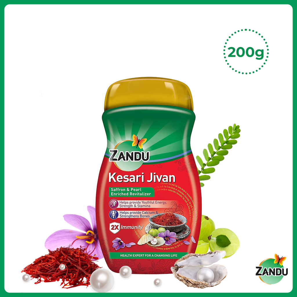 Zandu Kesari Jivan helps in boosting strength and stamina and keeps you energetic throughout the day. This revitalizer, enriched with saffron and pearl, provides you with a healthy dose of calcium thereby strengthening the bones. Regular use improves immunity.