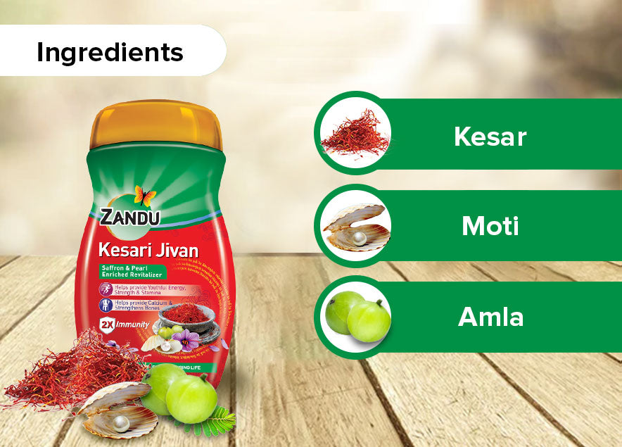 Zandu Kesari Jivan helps in boosting strength and stamina and keeps you energetic throughout the day. This revitalizer, enriched with saffron and pearl, provides you with a healthy dose of calcium thereby strengthening the bones. Regular use improves immunity.