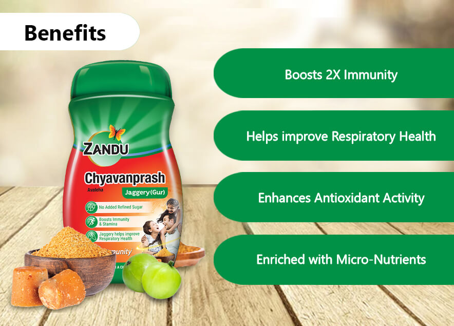 Zandu Chyavanprash Avaleha Jaggery is specially formulated with the goodness of Jaggery and other Micro-Nutrients to help improve respiratory health, enhance antioxidant activity and boost 2X immunity. Regular consumption of Chyavanprash Avaleha Jaggery is scientifically proven to build your immunity by protecting against several infections.