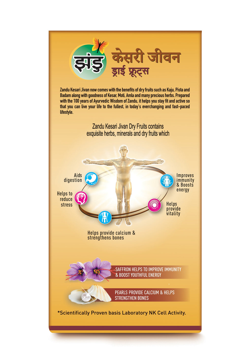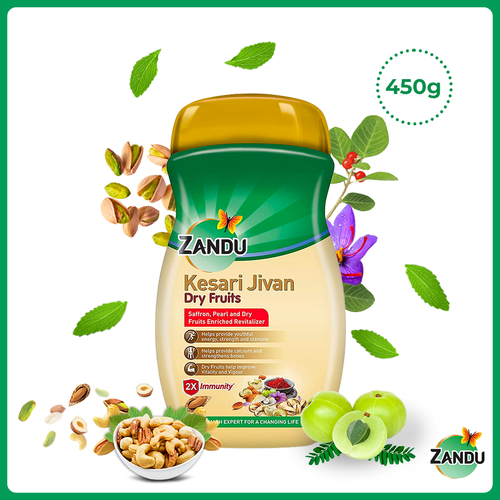 Zandu Kesari Jivan now comes with the benefits of Dry Fruits such as Kaju, Pista and Badam along with goodness of Kesar, Moti , Amla and many precious herbs. Prepared with the 100 years of Ayurvedic Wisdom of Zandu, it helps you stay fit and active so that you can live your life to the fullest, in today's everchanging and fast-paced lifestyle.