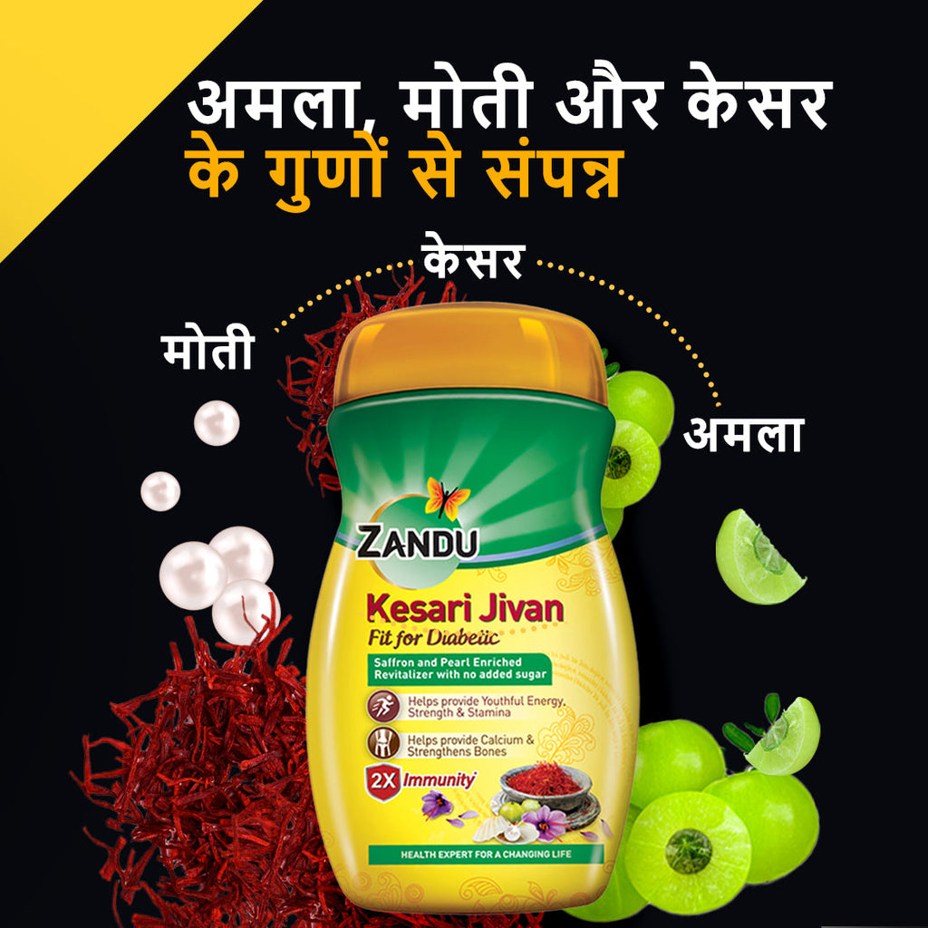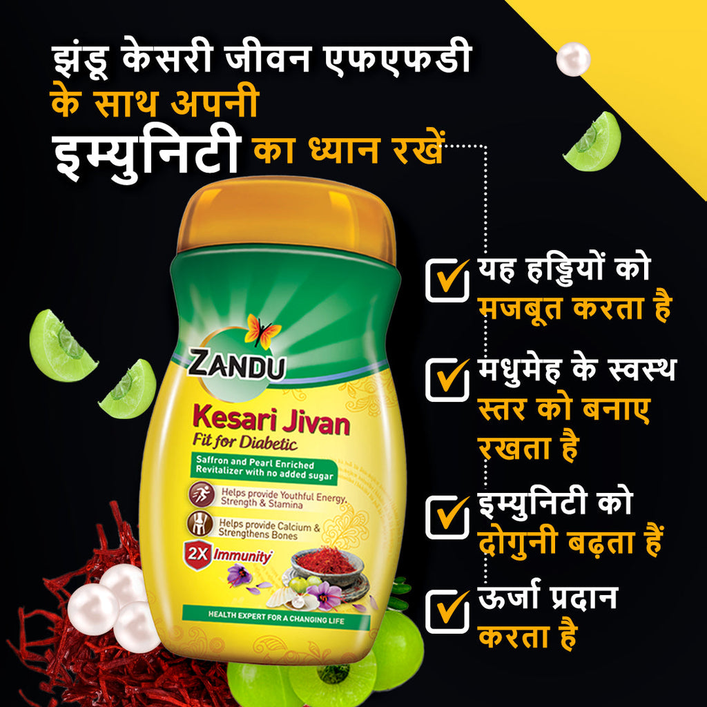 झंडू केसरी जीवन - एफएफडी का निर्माण विशेष रूप से मधुमेह के उच्च स्तर वाले रोगियों के लिए बिना चीनी के किया जाता है।