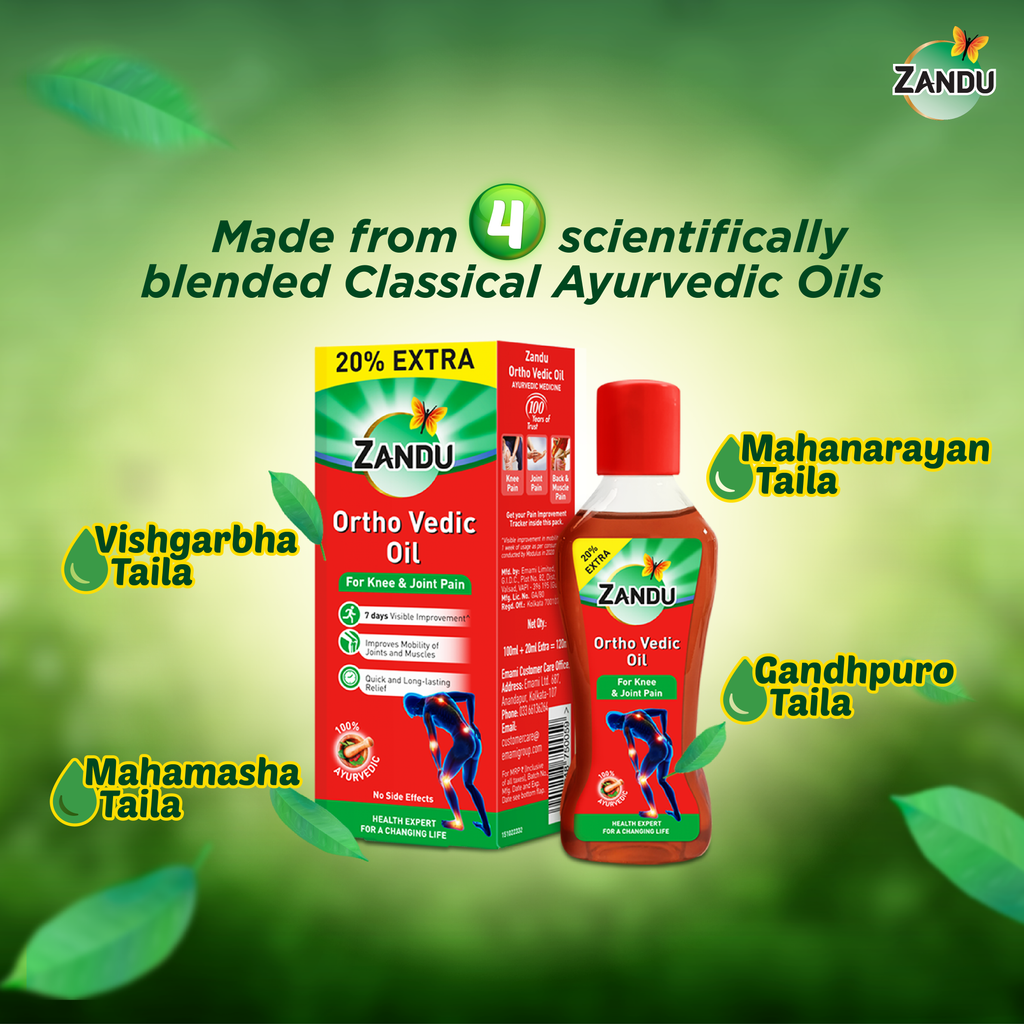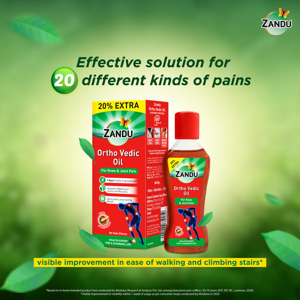 Zandu Ortho Vedic Oil is the 1st Knee & Joint Pain Relief Oil from the house of Zandu - the Pain Management expert. It gives you visible improvement in just 7 days and helps Improve the Mobility of Joints and Muscles by giving Quick and Long-lasting relief.