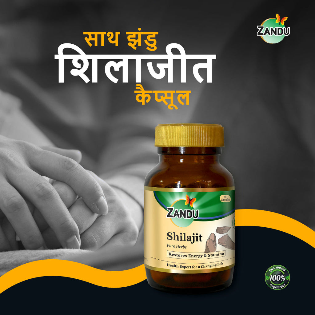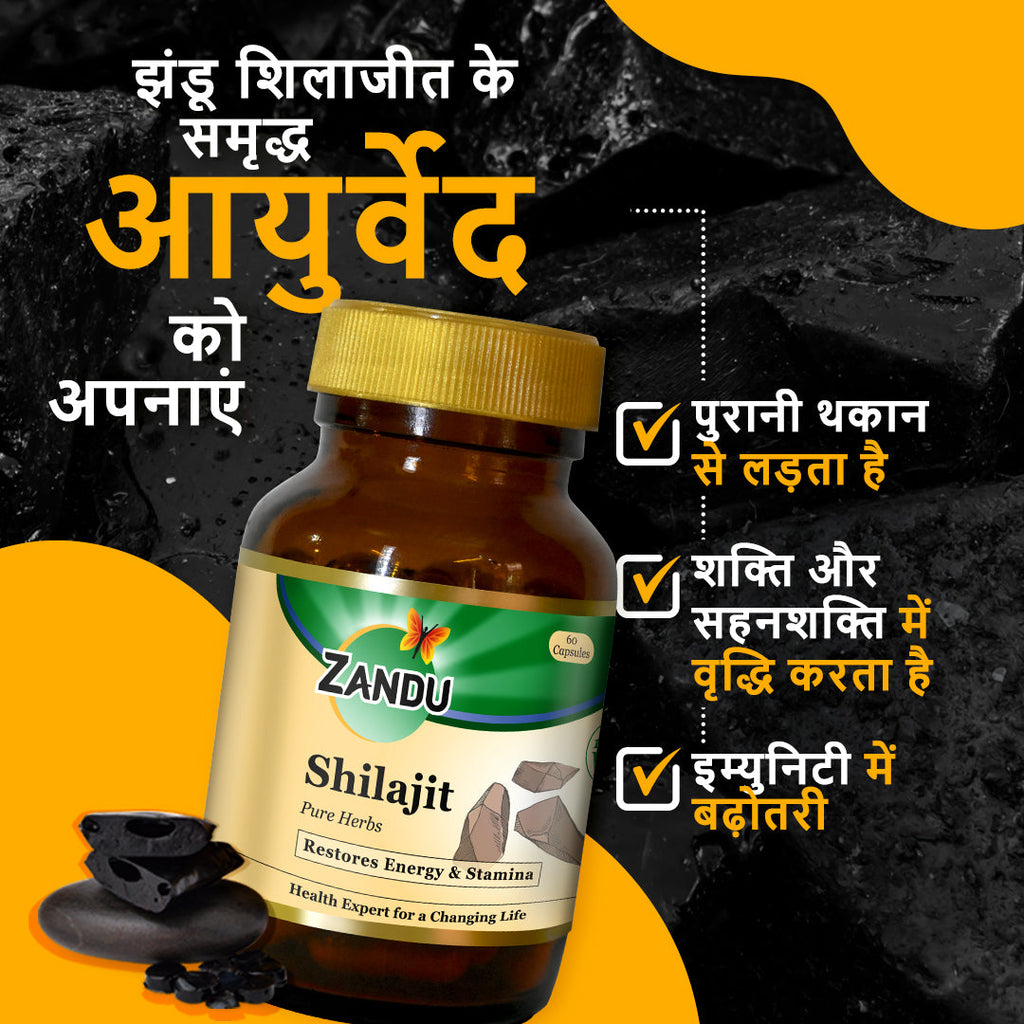 झंडु शिलाजीत शुद्ध जड़ीबूटी के 100% शुद्ध रस का उपयोग करके तैयार किया जाता है शिलाजीत, एक प्राकृतिक जड़ी बूटी है जो हिमालय में सर्वाधिक मात्रा में पाई जाती है। शिलाजीत ऊर्जा और सहनशक्ति को बढ़ावा देने में सहायता करता है, विशेषकर पुरुषों में। झंडू शिलाजीत कैप्सूल शरीर में रासायनिक प्रक्रियाओं को बढ़ावा देता है और प्रतिरक्षा क्षमता में सुधार करता है। इसके नियमित सेवन से संक्रमण दूर रहता है।