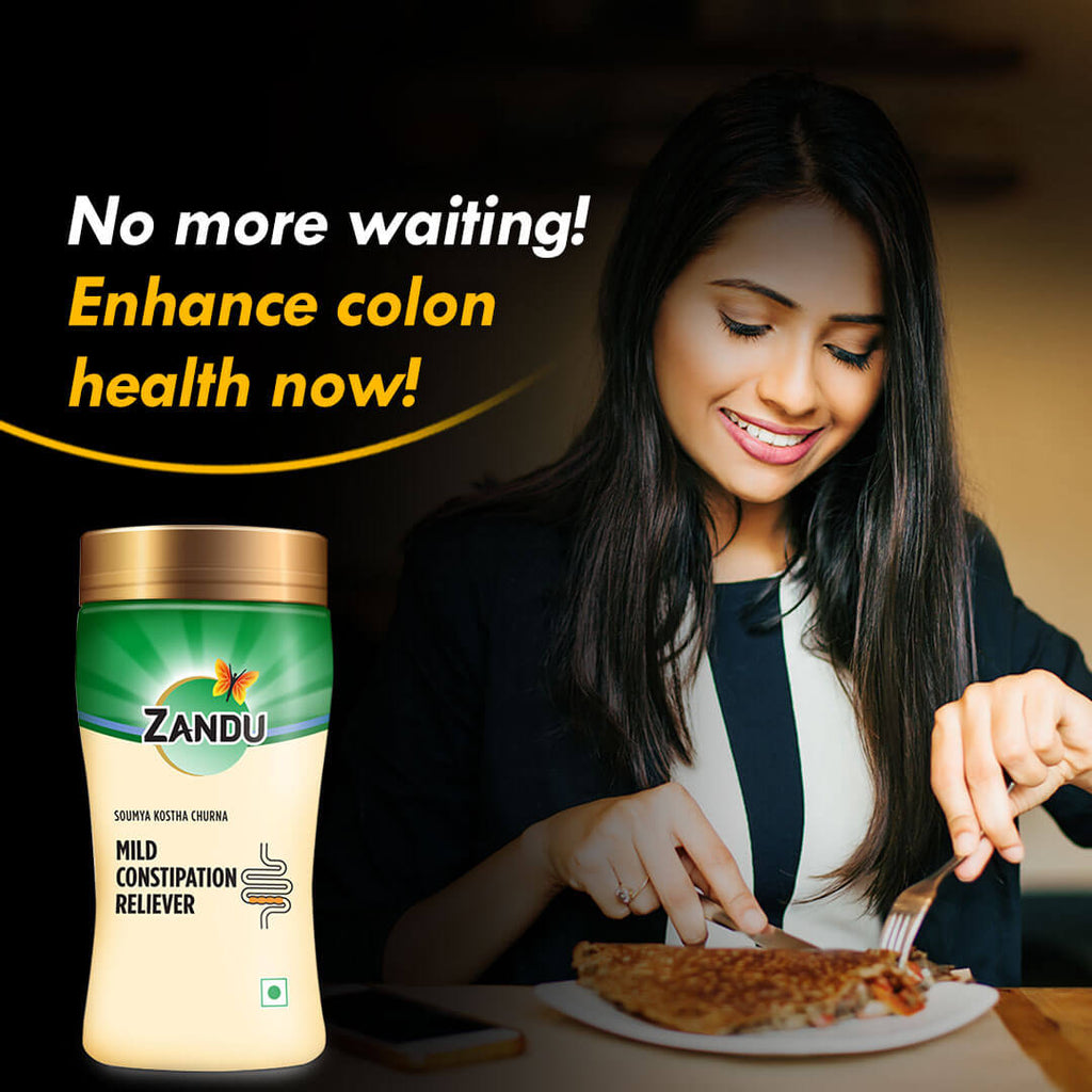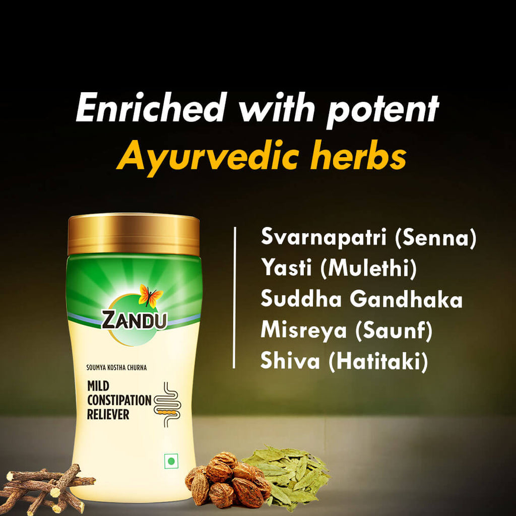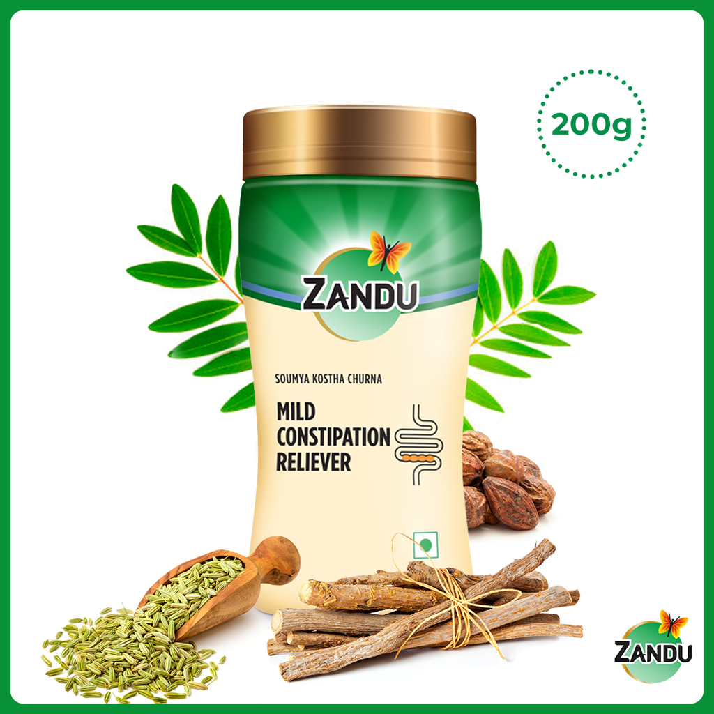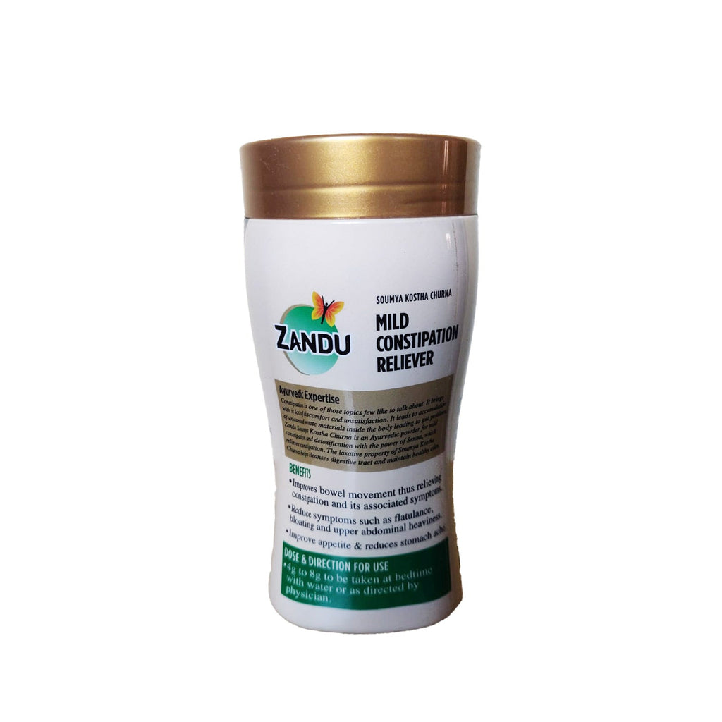 Are you suffering from constipation & want to get rid of constipation? Suffering from constipation often leads to loss of focus & mental agony. Zandu brings you Soumya Kostha Churna, an ideal solution for constipation and indigestion related challenges. It is a non habit forming Ayurvedic laxative formulation with a pleasant taste. Zandu Soumya Kostha Churna helps maintain gut health and provides relief from symptoms of indigestion such as tastelessness, loss of appetite, gas, acidity, flatulence, constipation, bloating and heaviness of abdomen. It’s about time to say goodbye to indigestion & constipation associated complications!