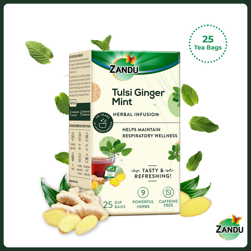 Take a break & refresh yourself with a cup of good health to rejuvenate and boost your overall health and wellness. Unlike other herbal tea, Zandu brings you tasty & preservative free Tulsi Ginger Mint Ayurvedic Infusion with zero bitterness that caters to everyday health needs. This herbal tea is enriched with the goodness of 9 powerful herbs to celebrate wellness by keeping health problems at bay. Tulsi helps in boosting immunity and reduces stress levels. Ginger aids in managing symptoms associated with indigestion like bloating, nausea, abdominal distension & flatulence. Mint supports digestion & relieves symptoms related to cold. Zandu Tulsi Ginger Mint Ayurvedic Infusion is a special herbal tea that supports respiratory health and wellness. Now celebrate true wellness with zero compromise on taste!