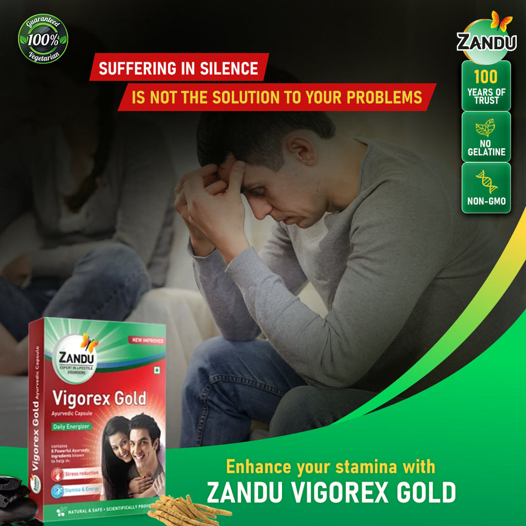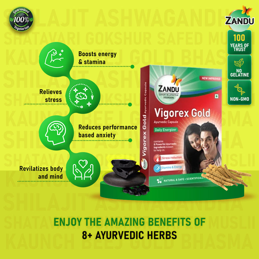 Zandu Vigorex Gold is a unique Ayurvedic revitalizer fortified with eight powerful Ayurvedic minerals and herbs, including Shilajit, Safed Musli and Ashwagandha. It helps relieve stress, improve stamina and boost energy and thereby helps you enjoy your married life.