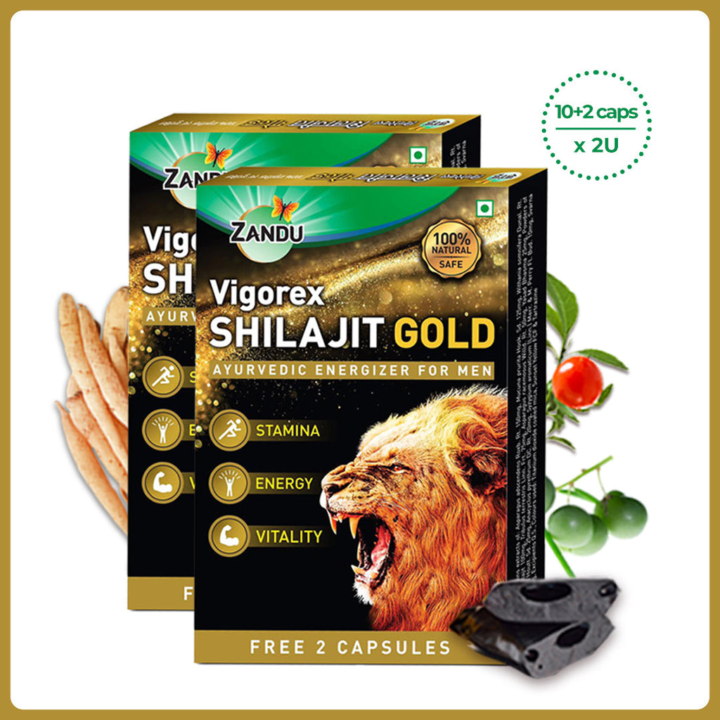 Zandu Vigorex Shilajit Gold is an Ayurvedic energizer for Men. It is enriched with various herbs & minerals like SHILAJIT, GOLD BHASMA, KAUNCH BEEJ, ASHWAGANDHA & SAFED MUSALI which help provide STAMINA, ENERGY & VIGOR